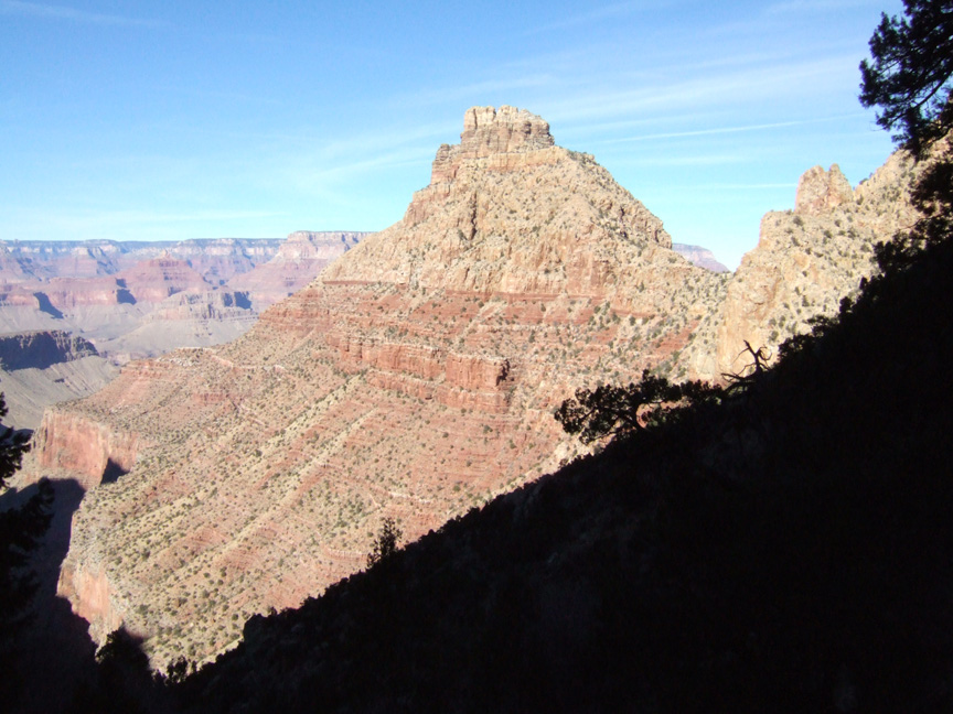 Access Even when the earliest major survey by Matthes-Evans was completed this trail had been destroyed by landslide and is not shown on this map. To find the head of this trail, locate the old viewpoint parking area (now filled in) northwest of elevation 7084. A fire-road turnoff on the south side of the road is OK as parking if you do not block the road and do not pull off the road into the trees, which could get you a ticket. A track follows the top of the cliff on the east side of the bay and is a convenient place to look down onto the route on the slope below. A view of the upper switchbacks will give you assurance that the trail exists and that you are in the right place. Older Grand Canyon hikers contemporaries of Harvey Butchart, Jim Ohlman and others may feel this route description is overly detailed and unnecessary. But erosion and other effects of time are making these places gradually more obscure and difficult to follow. I hope this description will be useful to the coming generation of explorers. The Route The route descends the ravine nearest the road that is the exact southernmost head of Hance Canyon. Follow the edge of the road to the west end of the area that was the old parking pullout, step up onto the rock at the rim and discover the cairn hidden below here and marking the head of the trail. This upper slope has a variety of deer-tracks through the brush with several possibilities for the initial descent. The actual historic trailbed is clearly present in the area near the top. Soon the old trail is confined between high cliffs on both sides of the ravine. A curious-looking rockpile can be seen atop the tower to the west. Descend following a series of intact switchbacks through trees and brush best to avoid going directly downslope and stay on the track to preserve the route from unnecessary erosion. Not far down you should arrive at a place to stand above a large boulder with a steep slide area below and to the right, and some rocky-brushy slope to the left, and no sign of a trail below. Either side is an access although it may not seem that way, but this is a hint to start looking for the crossover to the next ravine west somewhere not far below this place. Continue down the adjacent ravine either in the rocky center or among the trees going directly downslope from the spire at the point of the west wall of the upper ravine. After some distance of descent the slope conditions also deteriorate here and we can see why John Hance chose to abandon this place and construct an entirely new trail in Red Canyon for his thriving tour business. Near a large old weathered boulder in the middle of this ravine look for another track out to the west this crossover to the next ravine is even less distinct than the last possibly one of the few cairns here to mark the way. The crossover of this steep ridgeline between ravines clearly has no relation to the original trail and shows conclusively that the middle section of Old Hance is completely gone. Lower on the slope there are a few places that could be old trailbed but mostly either obliterated or overgrown and impassable. Descend this steep but mostly stable rocky ravine angling somewhat west in the direction of Sinking Ship (Three Castles). The bottom end of this ravine joins a larger ravine west of this minor break. The last section where the two ravines join is choked with boulders and rubble, old and new rockfall. A stubborn pine tree that has survived without being crushed holds the bank in place. From below, this tree obscures the entry to this ravine. This point where the ravines from above merge into a single drainage is the same elevation as Coronado Butte saddle to the east, which is a place to note along the Red Canyon Trail (photo). Alternate Route Above where these ravines combine, the main western ravine is a reasonable alternate route that I have traveled on three occasions. The Coconino section of the ravine is steep and loose. The upper slopes are mostly tree-covered and stable, unlike the track along the old trailbed. There are several minor cliff obstacles to bypass and getting out past the final cliff band at the top is not simple, but there is also less complication of changing across the various ravines and dividing slopes. The historic route is somewhat more direct to the road than this alternate; both being about an hour between here and the rim in either direction of travel. Lower Trail Section At the Esplanade cliff in the main ravine, look for a large rock and cairn on the right (piece of bedframe here). It is essential to get out of the main drainage and onto the east slope, but the terrain in making this transition can be extremely troublesome. There was a trail here, but there is little left now. Away from the bed this trail becomes more distinct and there are many small ducks to follow. The track leads down quickly and easily to a big cairn on a large hunk of limestone marking the descent into the Redwall just east of this point, which goes into the bed of the eastern ravine. The apparent instability of the slope above with numerous embedded boulders is rather frightening and this is no place to be caught in a rain or anytime shortly after. Going down to rejoin the main bed seems the obvious way, but this goes to a drop in the limestone that is not an easy bypass. The best way is to climb up onto the slope to the southeast above a small pouroff and follow this bench around the base of a limestone pinnacle separated from the cliff by a fault. The authentic trail was here, but with little sign remaining. This bench ends with a slope down into the bed. There are no more obstacles or other trail sections. At about the 4100 contour is a good seep-spring where Hance once had a cabin and a rock corral. Exploring the rock structures west of the streambed is a worthwhile diversion because rediscovering history is one of the likely reasons to come here. This can also be a useful stop for camp with available